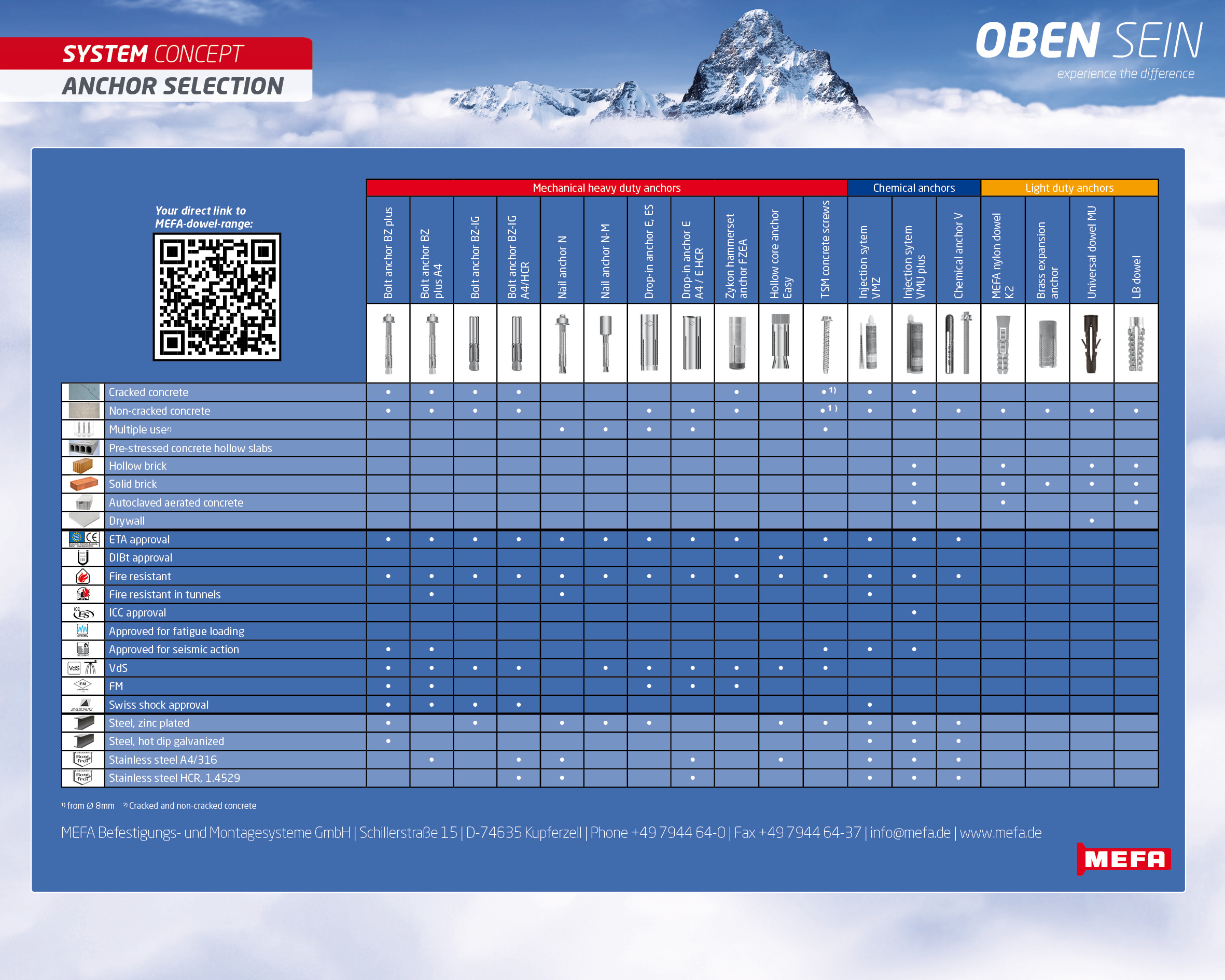 The dowel is a component that is taken for granted and is actually so much more complex than it appears at first glance. The variety of different dowels for different materials is indispensable these days. Basically, dowels are a component required in fastening systems, that is used to anchor attachments in floors, walls or ceilings. Our range at MEFA includes plastic, metal and chemical dowels.