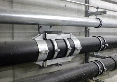 Wenn keine Druckstücke angeschweißt werden dürfen, weil die Rohrleitung zu dünn oder wie hier aus Kunststoff ist, kommen Festpunkte mit Klemmverbindungen zum Einsatz. Die übertragbaren Kräfte sind hier nicht so hoch.