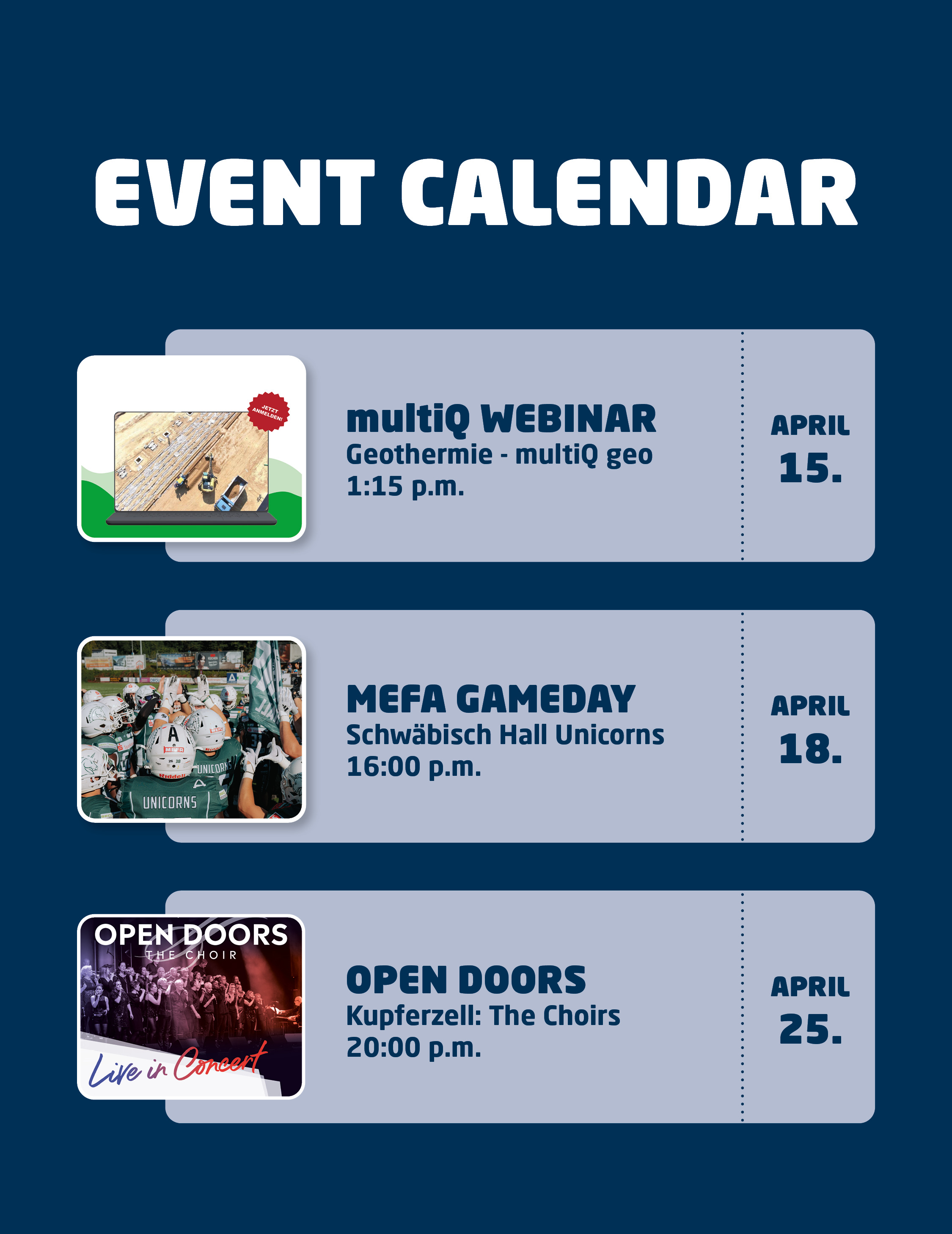 On April 25, you’re invited to the OPEN DOORS - THE CHOIRS event at the Carl-Julius-Weber Hall in Kupferzell. MEFA is a sponsor of the event. Enjoy OPEN DOORS live and up close. Tickets are available here.