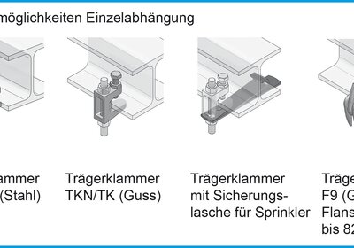 A single threaded rod for pipe suspension can also be fixed by means of beam clamps. However, certain requirements apply here. For example, most beam clamps are only suitable for steel beams with straight and non-inclined flanges. Beam clamps may only be loaded by vertical tension. They are also frequently used for sprinkler systems. According to VdS regulations, an additional safety lug must be provided for this purpose.